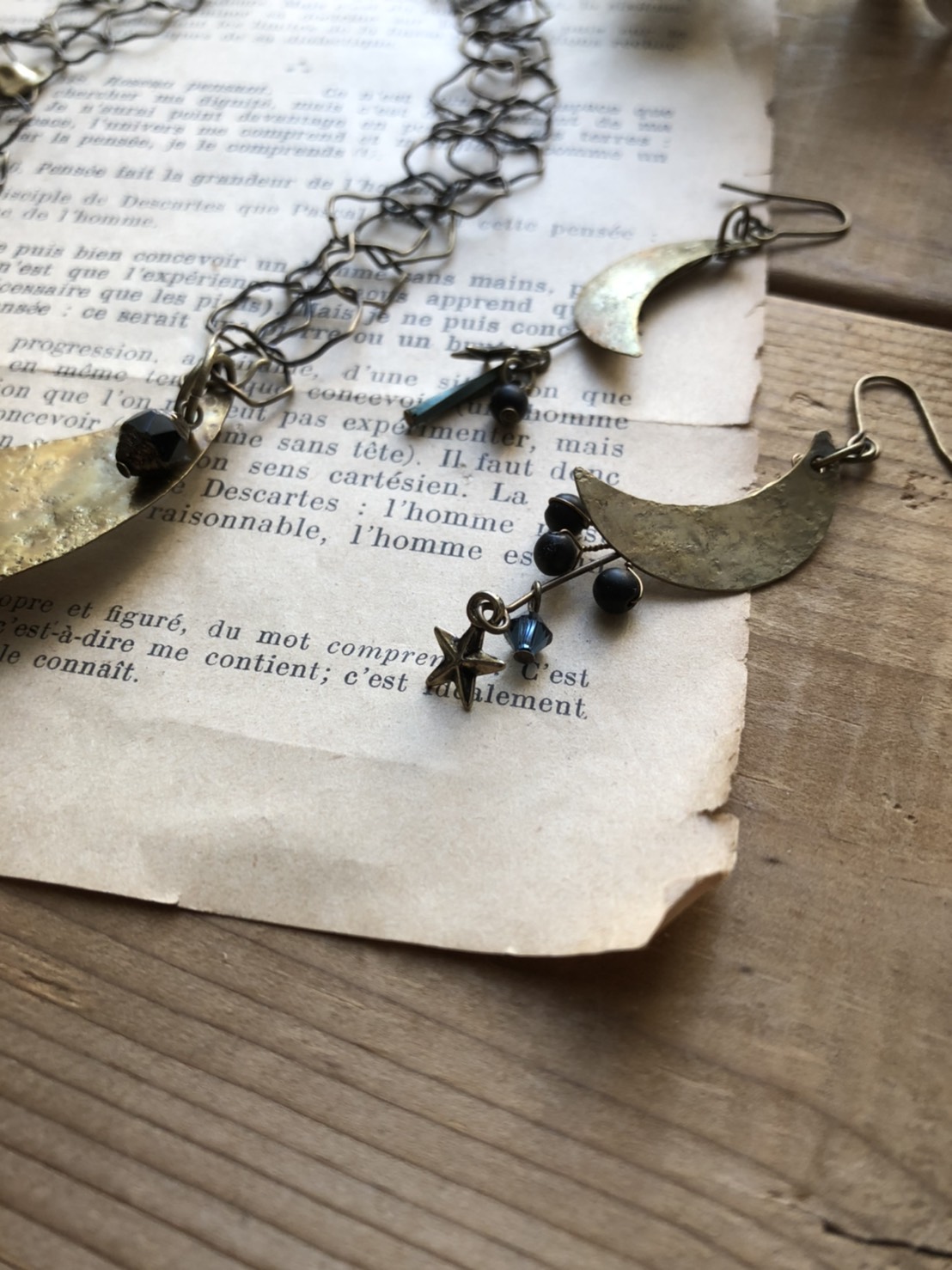 ⑥ピアスとネックレスに金属パーツを付けたら、月のアクセサリーの出来上がり。
