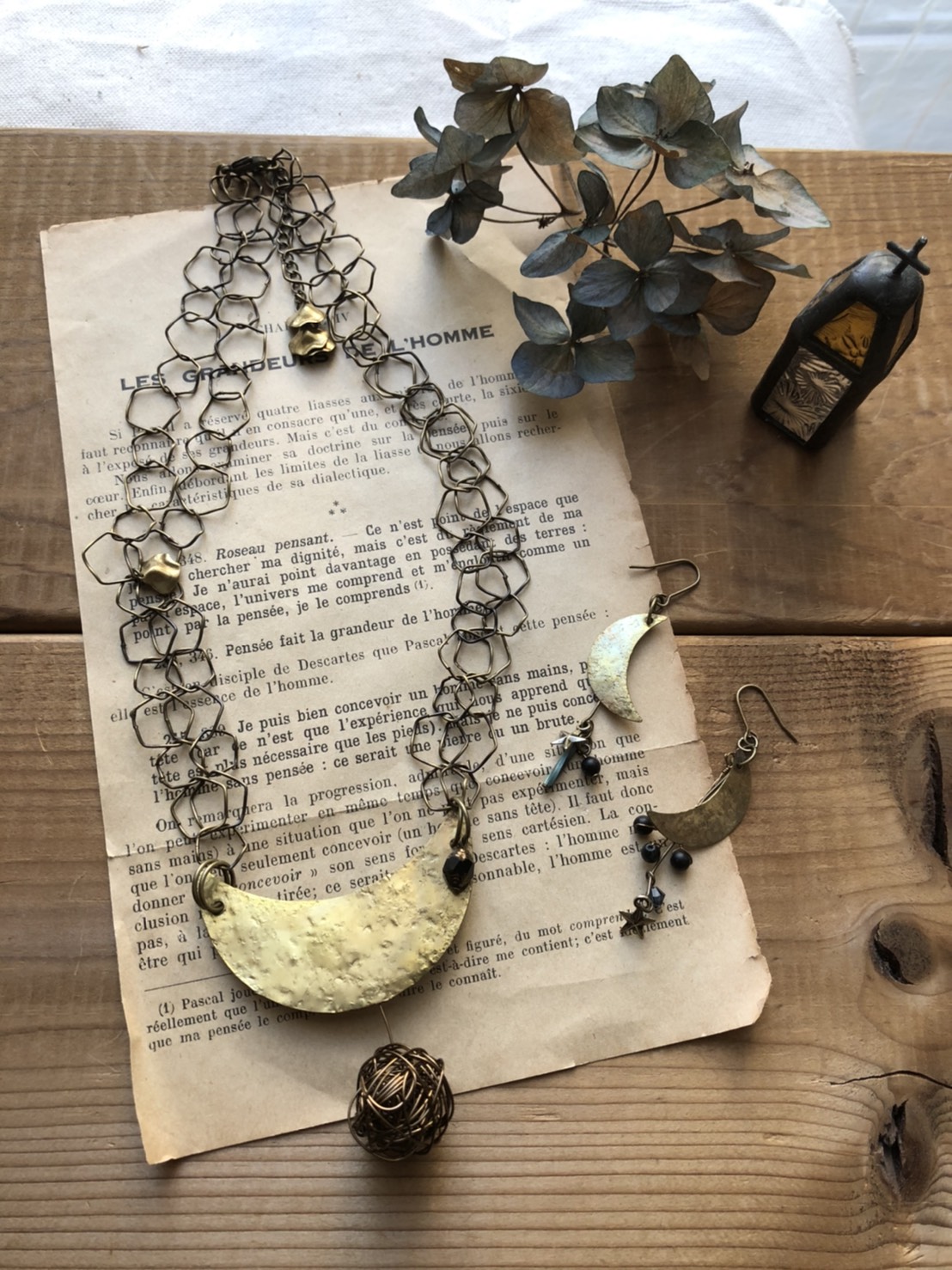 ⑥ピアスとネックレスに金属パーツを付けたら、月のアクセサリーの出来上がり。